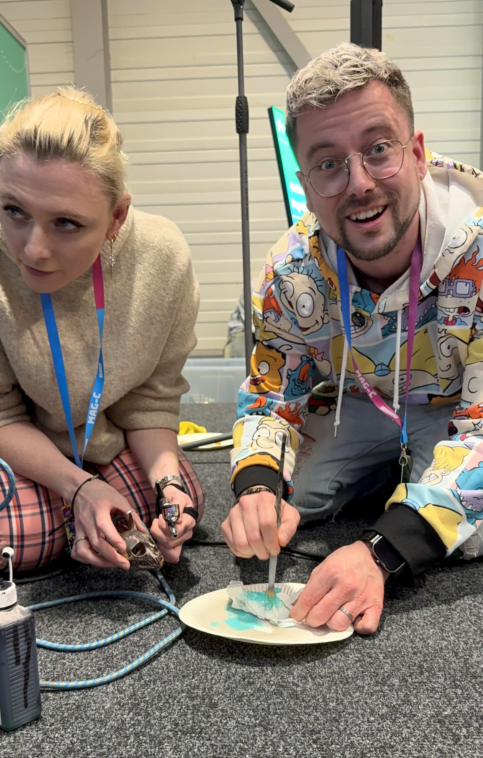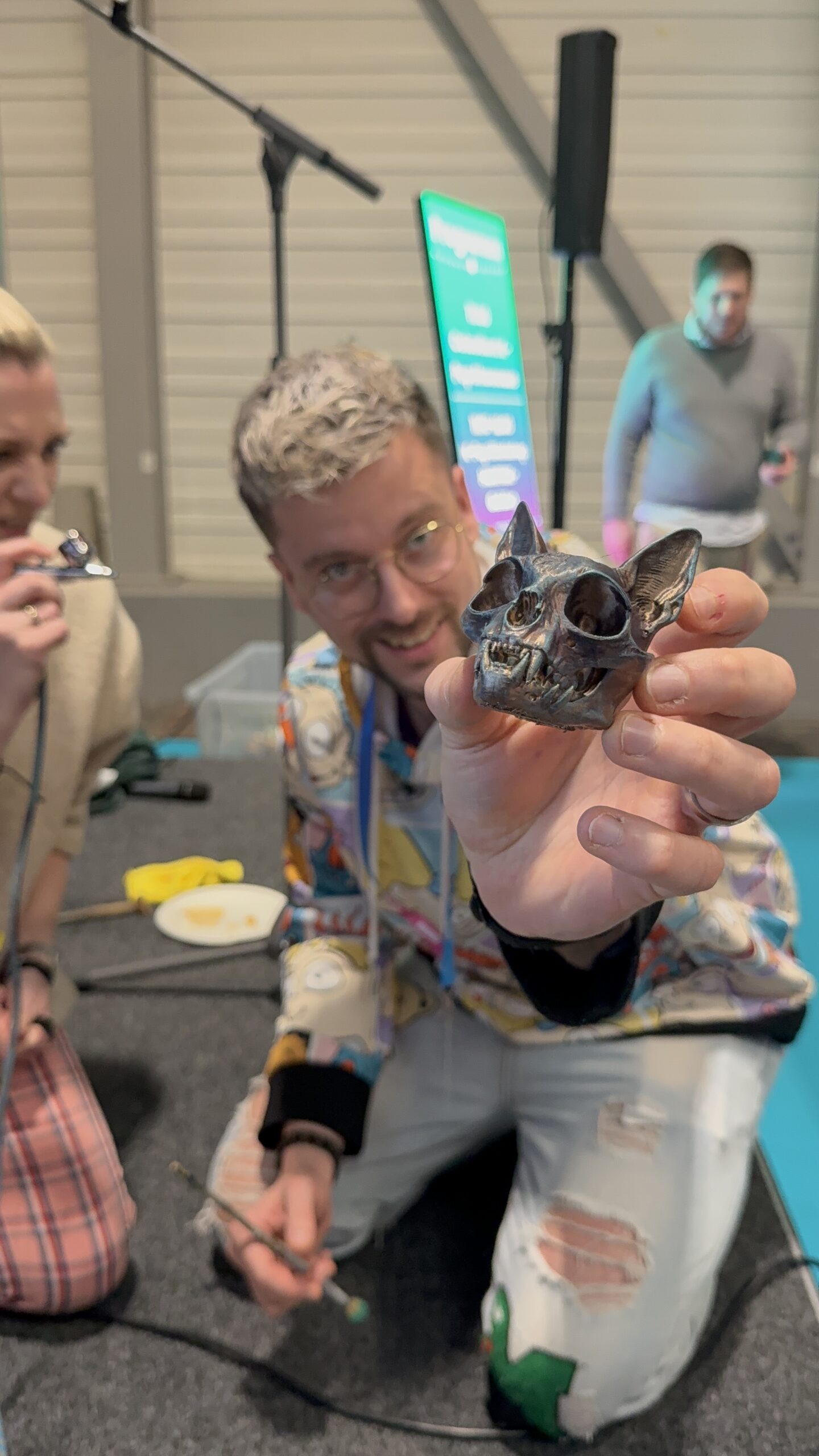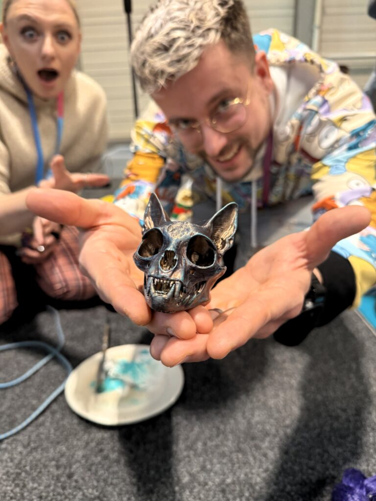 Ein ganz persönliches Highlight für mich war der 3D- und Paint-Workshop von Dinoshop Nerdstuff mit Keksbikini. Unter Anjas Anleitung durfte ich meinen eigenen 3D-gedruckten Dinoschädel mit der Airbrush bearbeiten. Dabei wurden verschiedene Techniken gezeigt, wie man einem Schädel eine möglichst realistische Optik verleiht – von Farbverläufen bis zu kleinen Details, die am Ende den Unterschied machen.